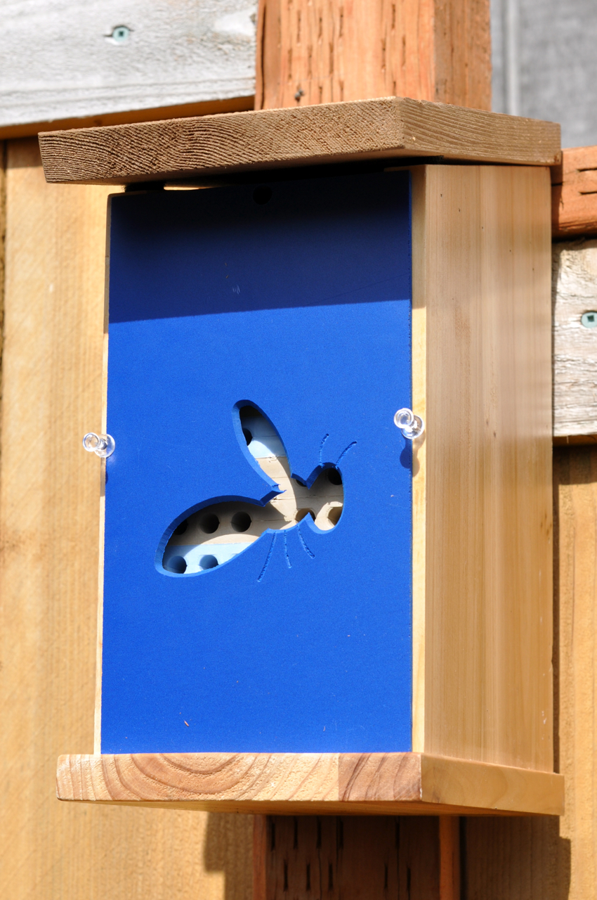 A look from the front - you can see the escape hatch at the top. Hopefully they will come back and reproduce in those little holes you see. In the fall I will collect them and put them in the crisper of the fridge. Then I'll clean the house and put it all back in the spring to start all over again.
